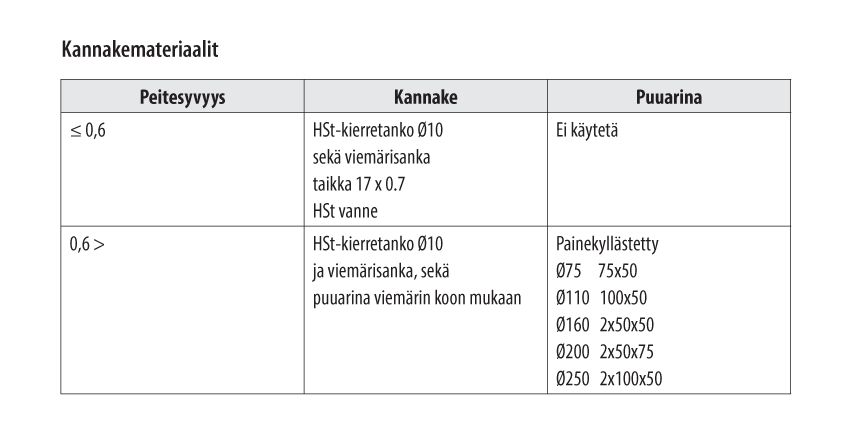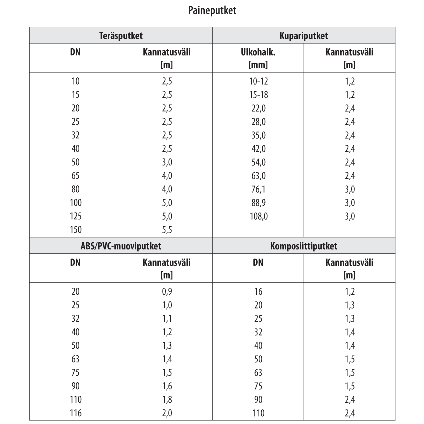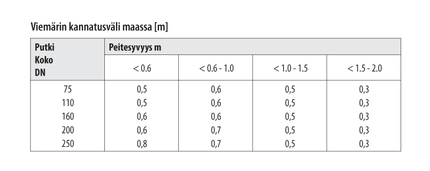 Mikäli viemärin alla ei ole puuarinaa (peitesyvyys alle 0.6 m) kannakkeet sijoitetaan jokaiseen muhviliitokseen. Suorilla osuuksilla kannakointi taulukon mukaisesti.