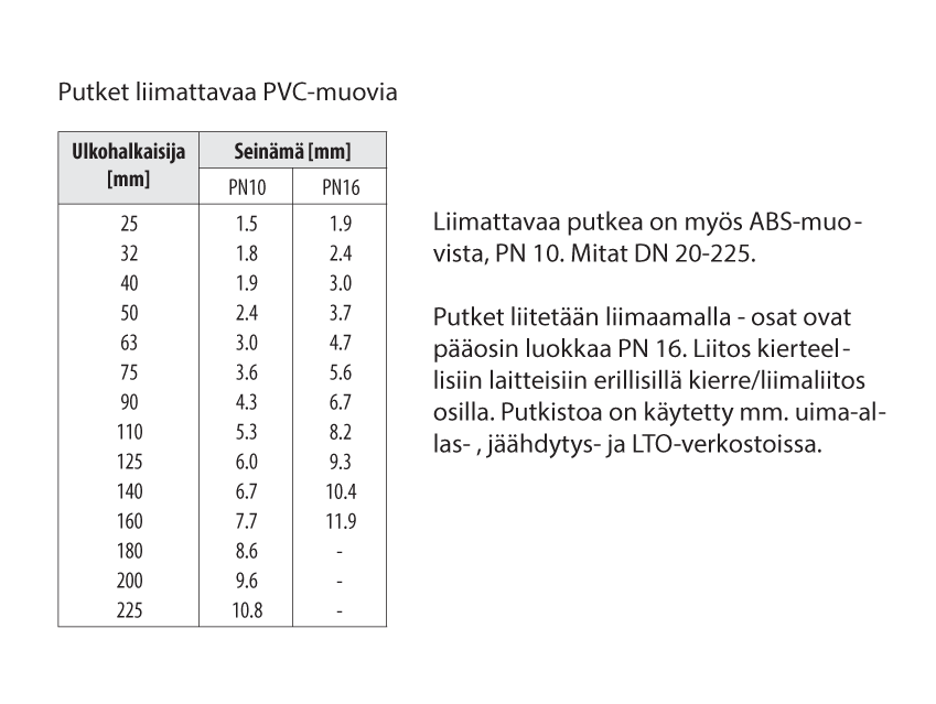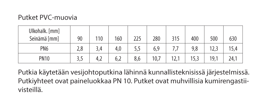Putkia valmistetaan useista eri materiaaleista ja useilla eri seinämäpaksuuksilla.
