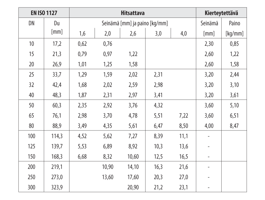 Ruostumattomat ja haponkestävät putket EN 10217-7/EN ISO 1127