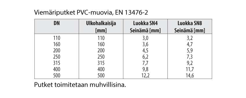 Mikäli viemärin alla ei ole puuarinaa (peitesyvyys alle 0.6 m) kannakkeet sijoitetaan jokaiseen muhviliitokseen. Suorilla osuuksilla kannakointi taulukon mukaisesti.